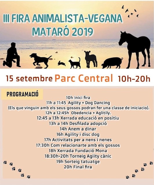 III FIRA ANIMALISTA VEGANA 2019!! Publicado el 13 agosto, 201911 octubre, 2019 por associacioggrescat No os perdáis la III FIRA ANIMALISTA el 15 de Septiembre de 10:00 a 20:00h en el Parc Central de Mataró!!! Os esperamos! 🙂 Comparte esto: Compartir en X (Se abre en una ventana nueva) X Comparte en Facebook (Se abre en una ventana nueva) Facebook Me gusta Cargando...